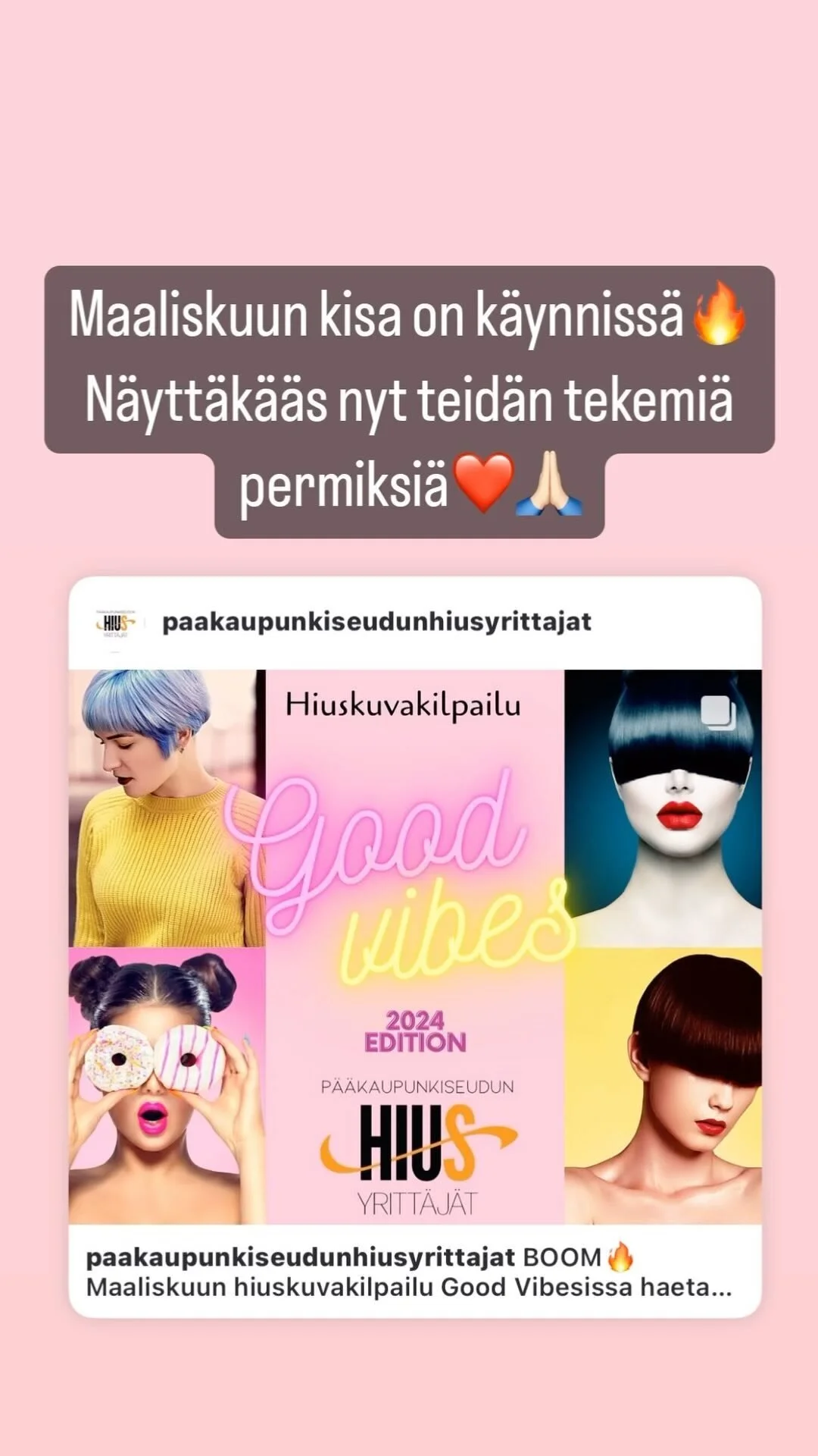 “Järjestämme Instagramin puolella joka kuukausi käytävää hyvän mielen Hiuskuvakilpailu Good Vibesiä vaihtuvilla aihealuella, tervetuloa mukaan kilpailemaan”